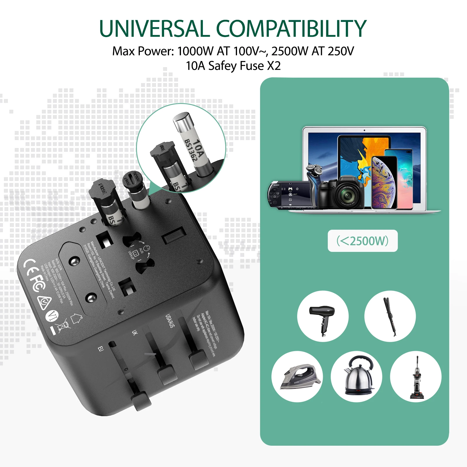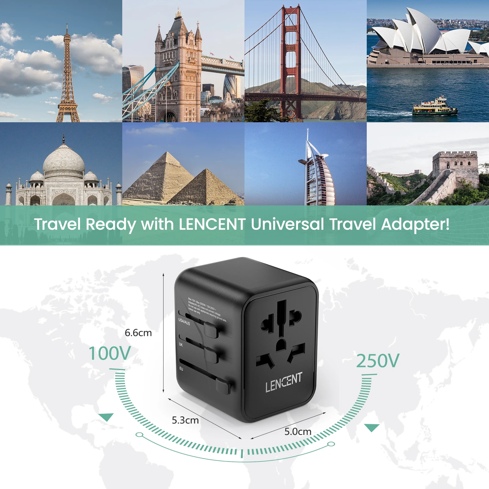 LENCENT travel adapter is FCC CE Certificated. The quality and stability are ensured. Equipped with integrated double 10A fuse which can protect your electric devices from over-current, over-charge, short-circuit and over-heated. This charger is smaller than standard adapters and with better heat dissipation.